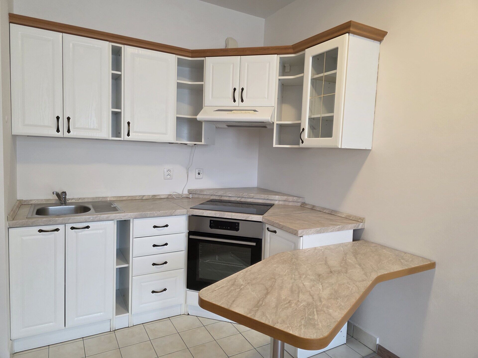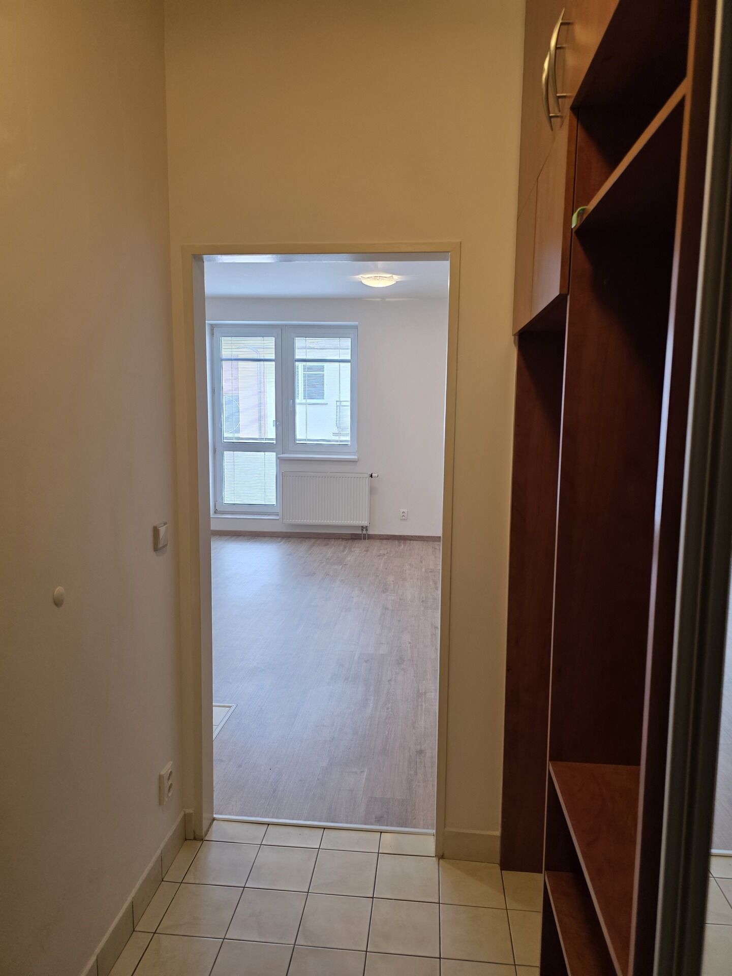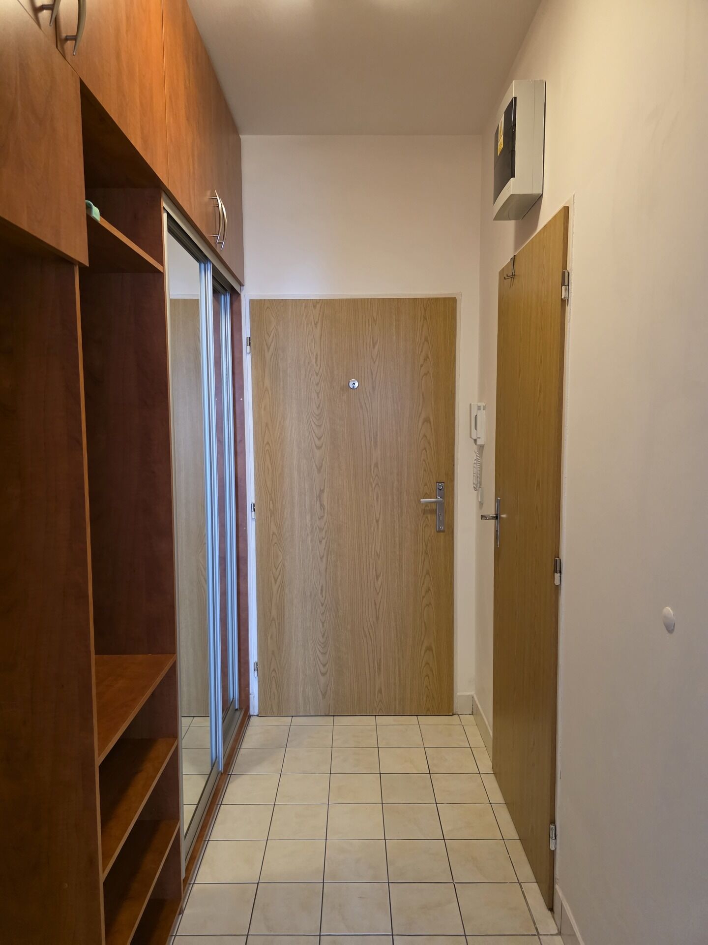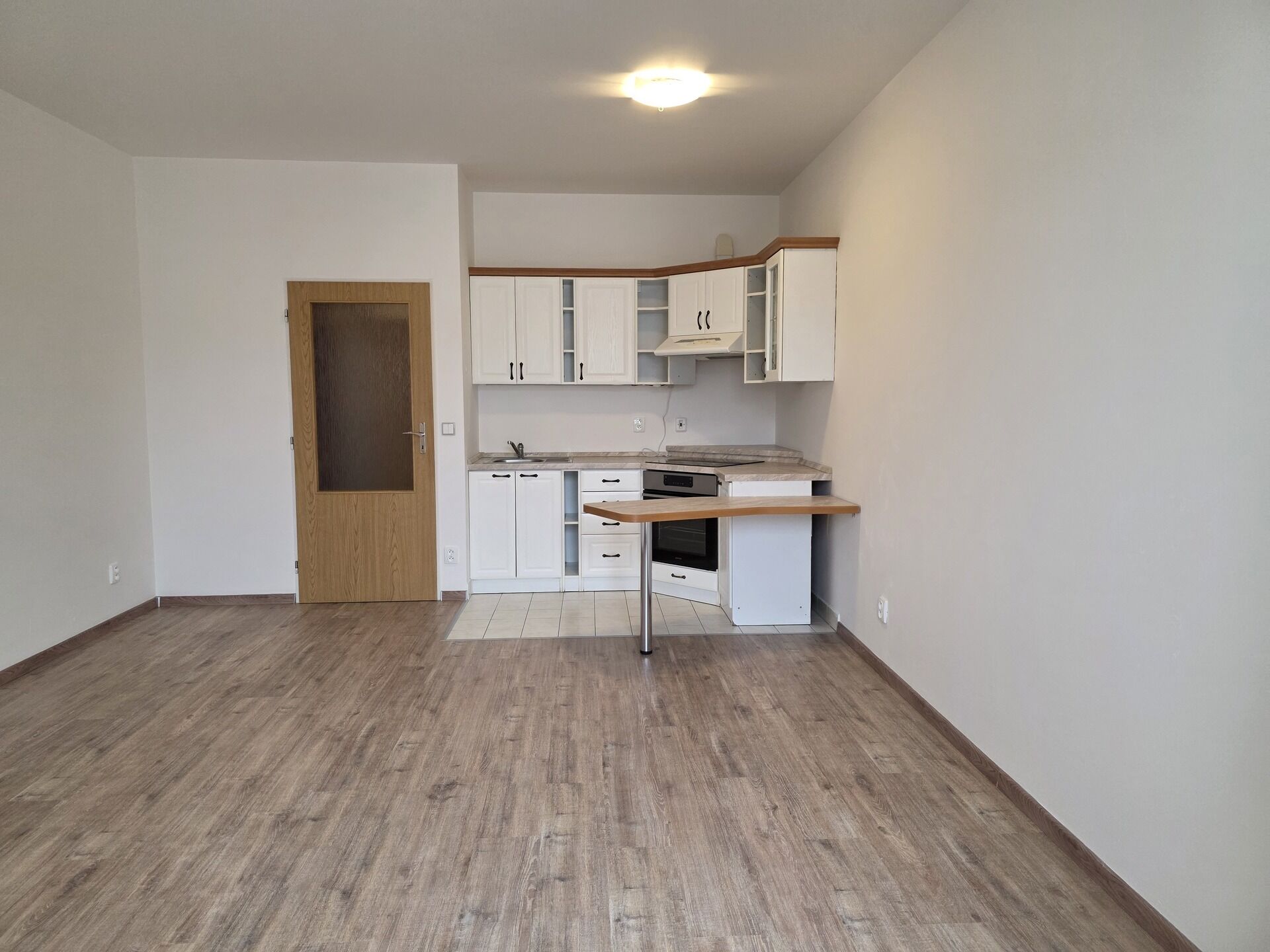 Pokoj s vybavenou kuchyňskou linkou, vestavěná šatní skříň v předsíni, koupelna se sprchovým koutem a toaletou. Balkon 5 m².