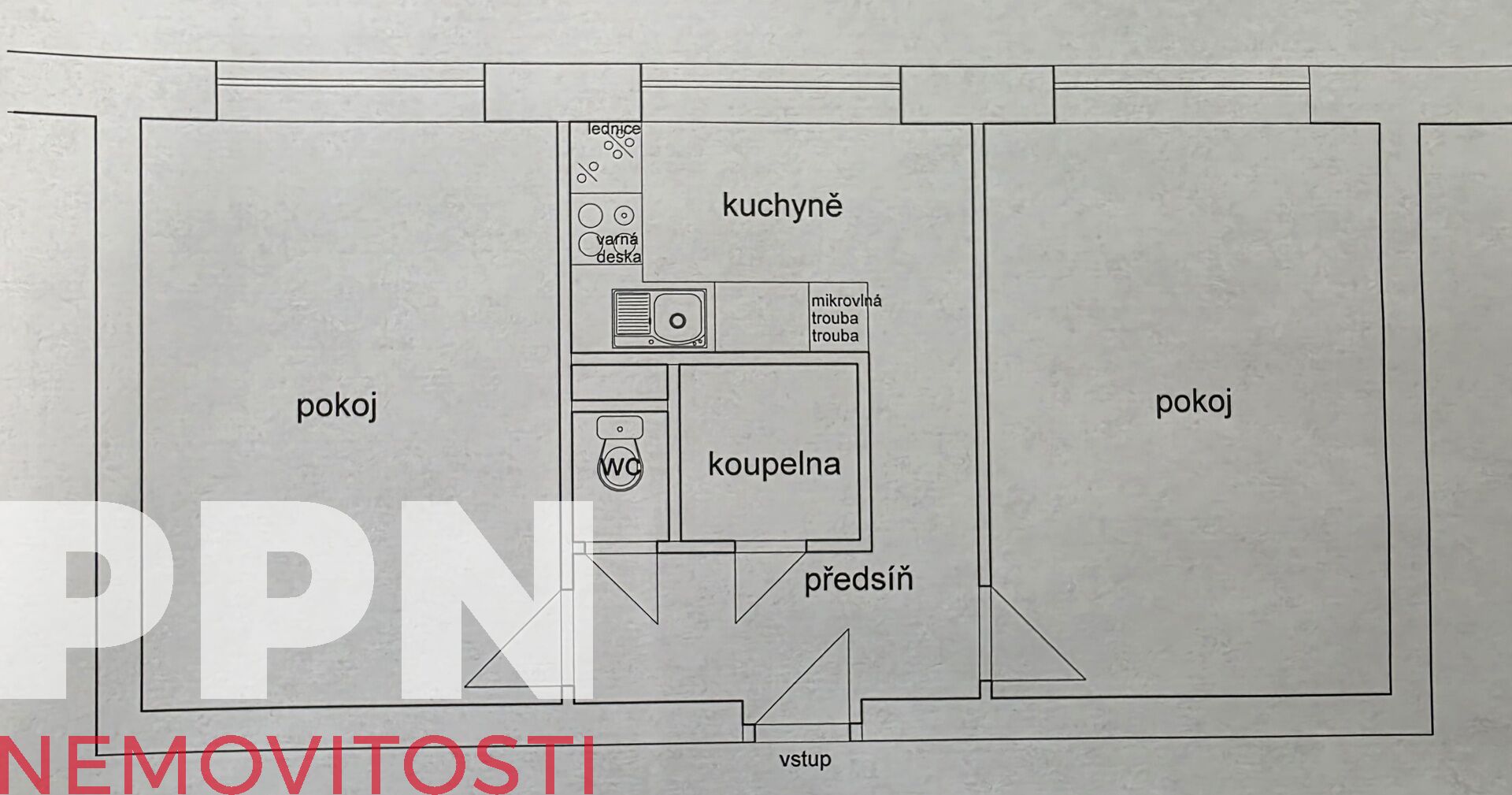 Dispozice bytu zahrnuje kuchyni, dvě obytné místnosti, předsíň, samostatnou koupelnu a toaletu. K bytu náleží sklepní kóje 1,7 m².